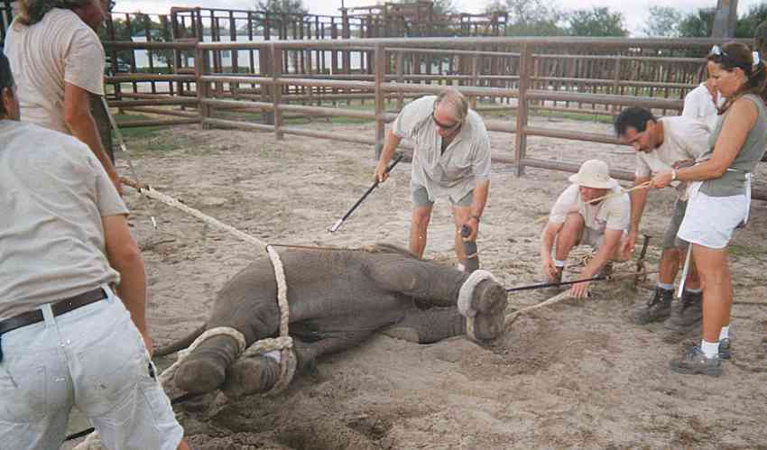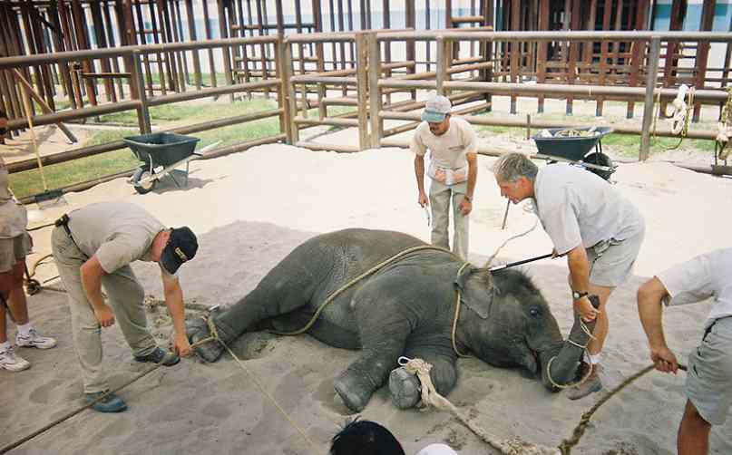 Cuando tienen menos de tres meses los separan de sus madres, los atan de cuello y patas para alejarlos de ellas, los mantienen durante 23 horas seguidas encadenados en galerones de cemento para literalmente "quebrar su espíritu" y después los "educan" con toques eléctricos, palos con ganchos que perforan su piel, cuerdas y golpes.