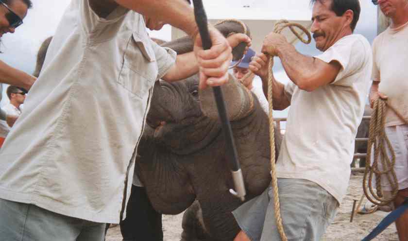 Cuando tienen menos de tres meses los separan de sus madres, los atan de cuello y patas para alejarlos de ellas, los mantienen durante 23 horas seguidas encadenados en galerones de cemento para literalmente "quebrar su espíritu" y después los "educan